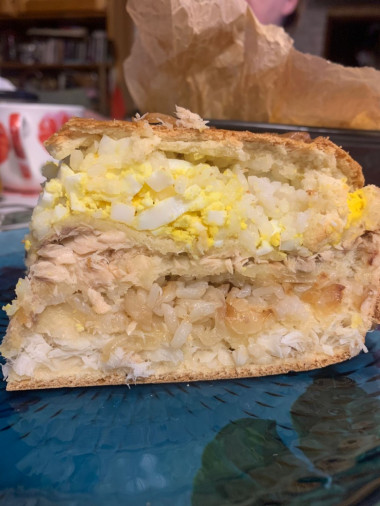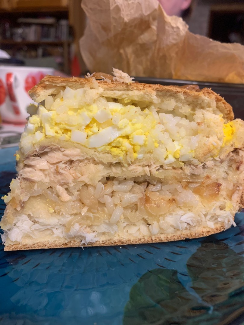 Ну, что сказать? Получилось отлично! Я немного дополнил начинку оставшимся рисом, смешав его с яйцами в верхнем слое и добавил к первому слою риса обжареного лука, но в целом рецепта придерживался строго. Отличное тесто, да и вообще всё гармонично.