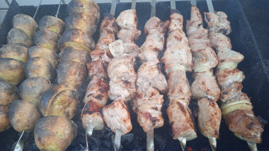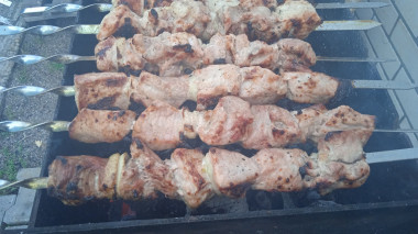 Доведите шашлыки до готовности. Проверить не сырое ли мясо внутри можно сделав надрез на самом крупном куске шашлыка, если выделяется белый прозрачный сок, шашлык готов.