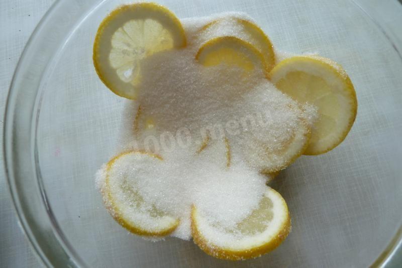 Получившиеся кружки разложите в какой-нибудь достаточно глубокой миске. Обсыпьте кусочки сахаром и закройте миску тарелкой. Оставьте лимон с сахаром на 20 минут.