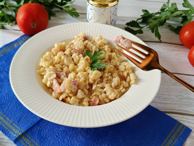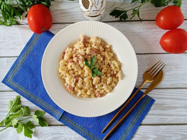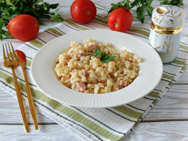 Как сделать птитим в сливочном соусе? Подготовьте продукты. Бекон возьмите сырокопченый, но вообще подойдут любые колбасные изделия, какие есть под рукой — все равно получится вкусно. Сливки подойдут 10 или 20%, жирнее не берите, будет слишком калорийно.