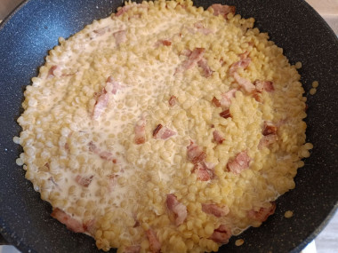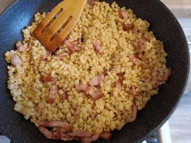 Когда птитим будет готов, откиньте его на дуршлаг, а затем переложите в сковороду к бекону. Перемешайте.