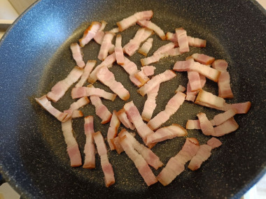 Бекон нарежьте на полосочки или кубики, какая форма вам больше нравится.