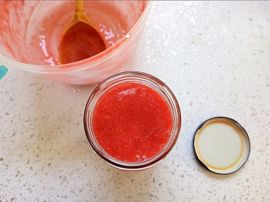 Когда сахар полностью растворится, еще раз хорошо перемешайте клубничное пюре и разлейте по баночкам. Закройте банки стерилизованными крышками. Можно заготовку закатать или закрутить винтовыми крышками. Из указанного количества ингредиентов у меня получилось 2,8 л заготовки. Клубнику, перетертую с сахаром, обязательно нужно хранить в холодном, темном месте. При оптимальной температуре хранения +2-4 градуса такая заготовка может храниться 6-7 месяцев.