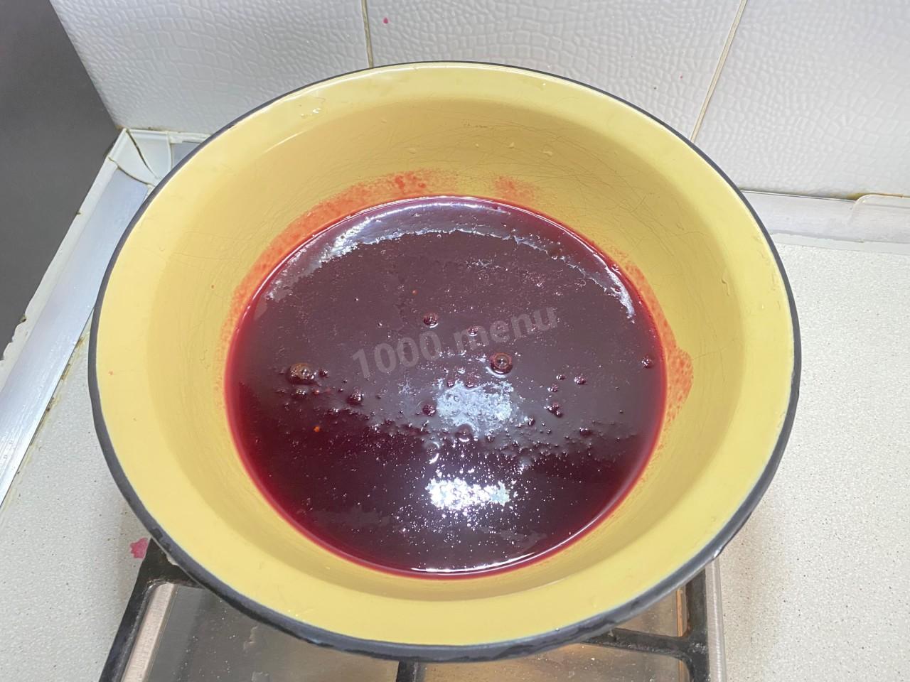 Перетертый конфитюр верните в кастрюлю, влейте в кастрюлю разведенный агар-агар, перемешайте и варите приблизительно 5 минут. Точное время будет зависеть от особенностей работы вашей плиты и готовности конфитюра. Сначала он будет жидким, но при остывании заметно загустеет.
