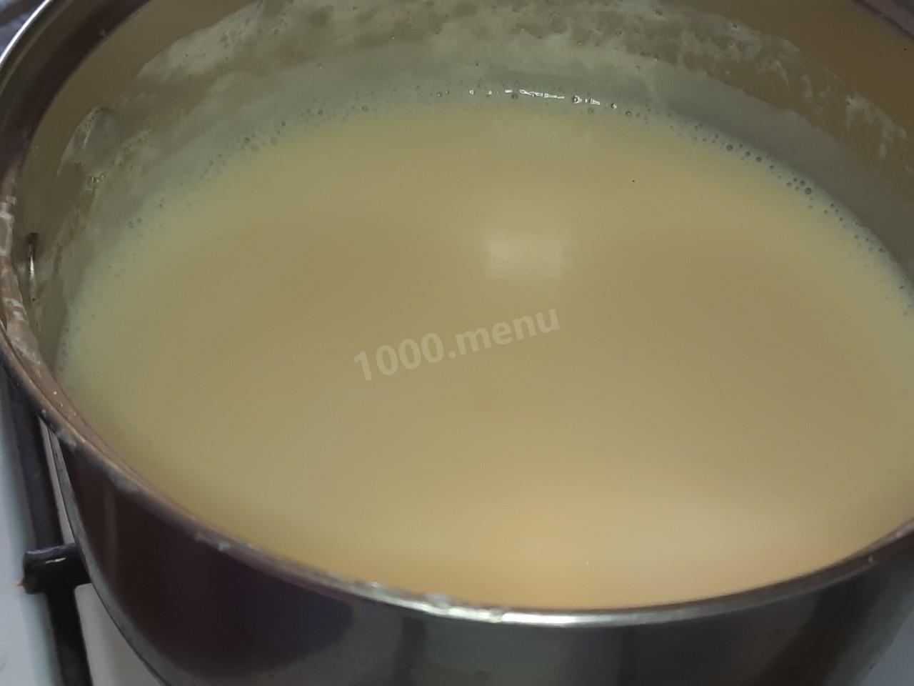 В ковшик налить молоко, добавить крахмал, яйцо и сахар. Варить на медленном огне, до загустения. В среднем, уходит пять минут.