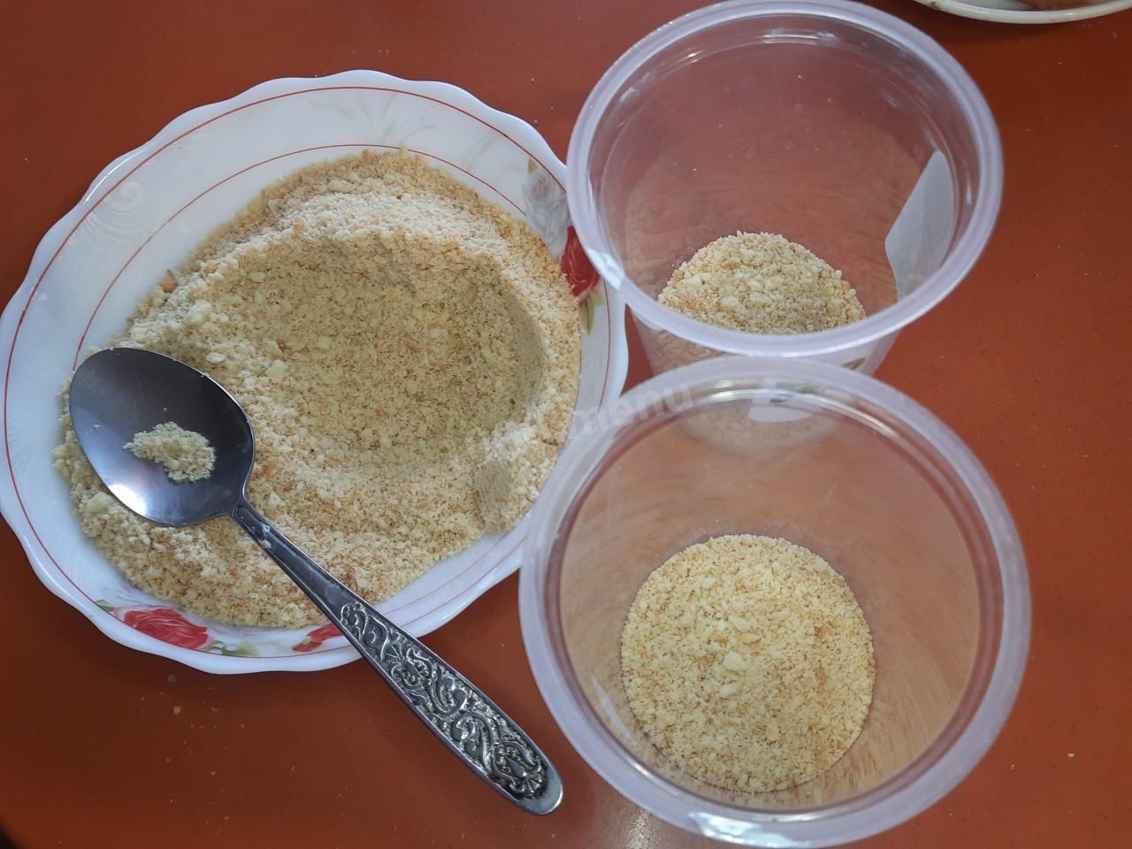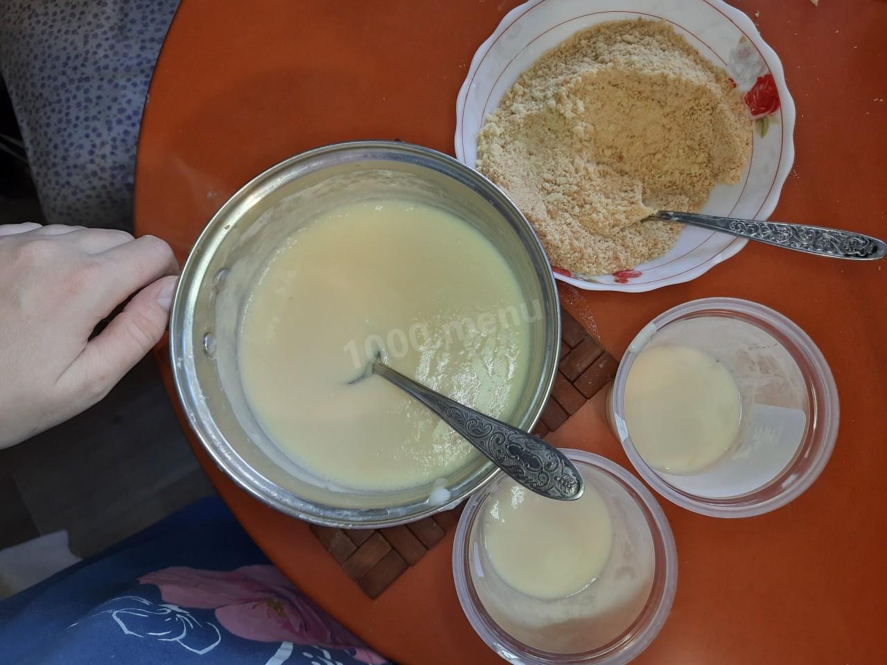 На дно стакана выкладываем немного крошки, затем крем, снова крошку.