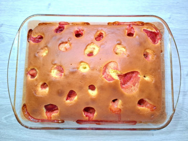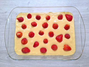 Возьмите форму, подходящую для выпечки. У меня керамическая, диаметром 20см. Смажьте ее каплей растительного масла. Вылейте в нее тесто, разровняйте его по всей форме. Сверху выложите ягоды клубники. Если они свежие, то отрежьте предварительно плодоножки. Крупные ягоды разрежьте пополам. С выбором формы для запекания поможет статья по ссылке в конце рецепта.