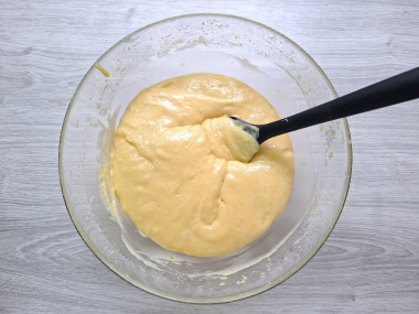 Всыпьте в тесто просеянную муку, смешанную с солью и разрыхлителем. Перемешайте сначала миксером, а затем лопаткой. Тесто получится немного гуще, чем на оладьи. В зависимости от качества муки её может понадобиться чуть больше или чуть меньше. Подробнее о свойствах муки, а также о нюансах работы с разрыхлителем читайте после описания рецепта.