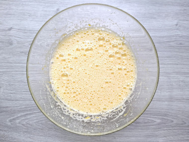 Сразу включите разогреваться духовку на 180°С. Яйца вбейте в миску. Начните их взбивать с сахаром. Взбивайте яйца до пышной светлой массы — она увеличится в объеме в два-три раза. О том, как правильно взбивать яйца, читайте в конце рецепта в отдельной статье.