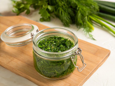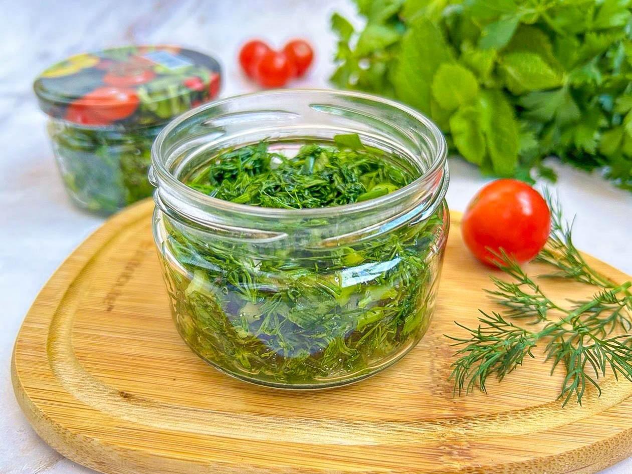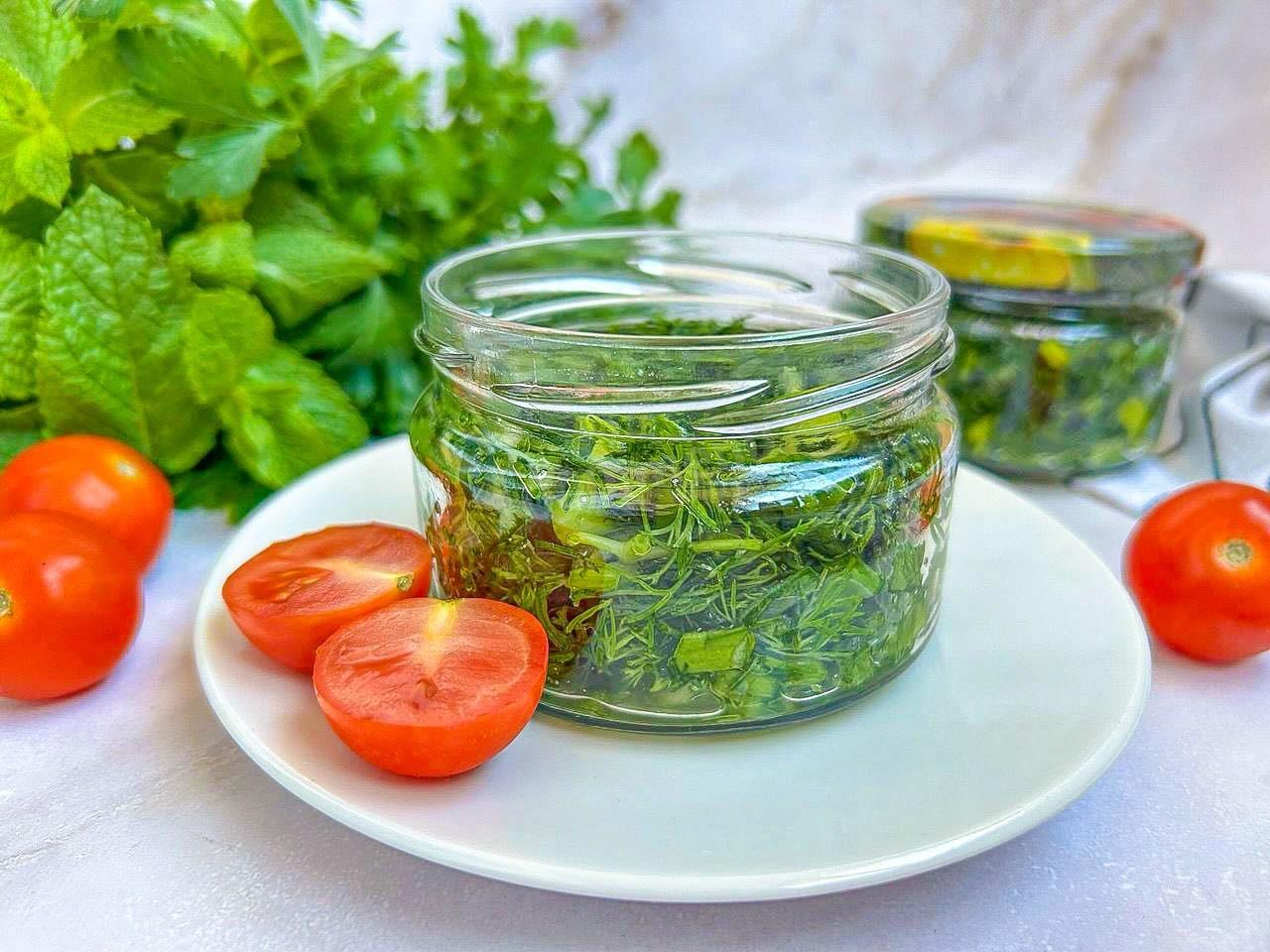 Храните заготовку в холодильнике приблизительно 2 - 3 недели. Зелень можно заморозить для более долгого хранения. Как понять, что заготовка испортилась? Откажитесь от употребления заготовки, если вы заметили плесень, скользкую пленку, неприятный кислый или гнилостный запах, либо если крышка банки вздулась. Приятных заготовок!