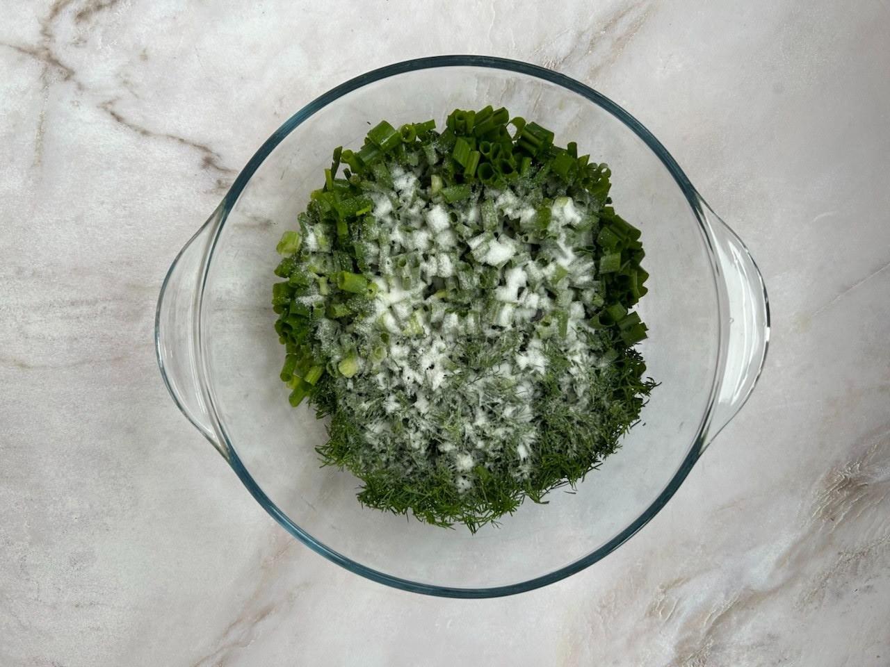 При помощи острого ножа мелко нарежьте укроп и зеленый лук. Переложите зелень в миску и засыпьте солью. Тщательно перемешайте зеленую массу. Через несколько минут она немного осядет и потемнеет, выделив сок.