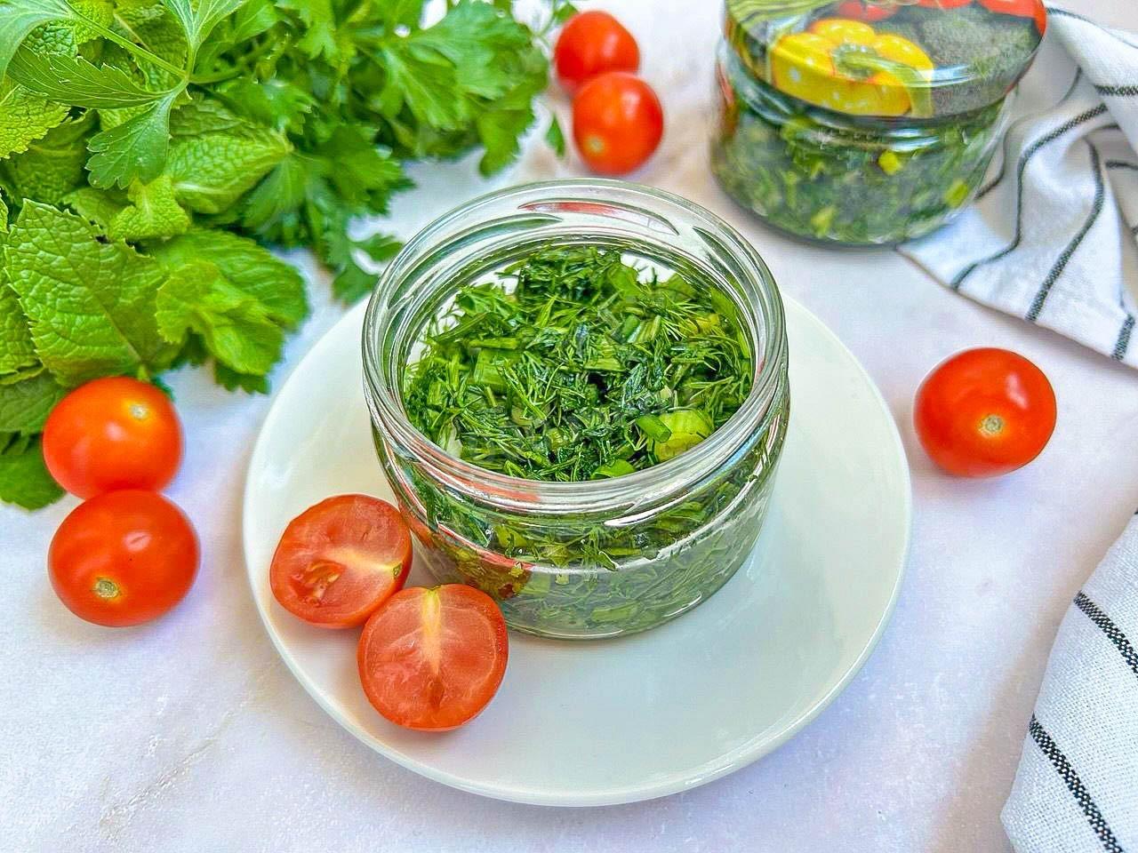 Промойте банки с содой и простерилизуйте любым способом, крышки прокипятите примерно 5 минут. Зелень удобнее раскладывать по маленьким баночкам. О том, как правильно стерилизовать банки читайте в конце рецепта. Выложите полученную смесь в стерилизованные банки, плотно утрамбовывая. Закройте банки крышками и уберите в холодильник для хранения. При использовании такой зелени в разных блюдах, учитывайте, что заготовка уже содержит достаточное количество соли