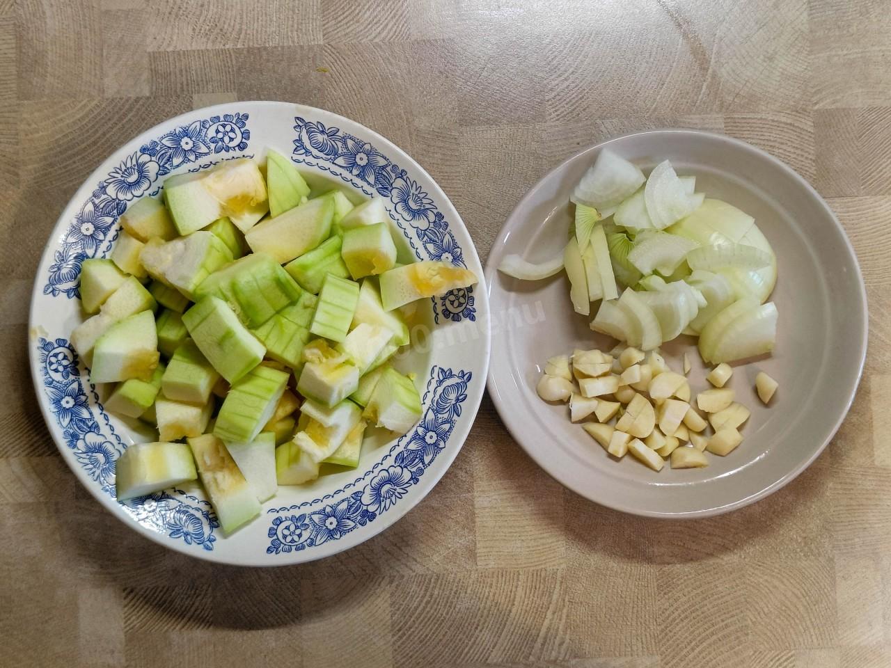 Нарежьте кабачки небольшими кусочками, удобными для перекручивания на мясорубке. Лук и чеснок очистите и нарежьте лук перьями или полукольцами. Для того, чтобы лук не раздражал глаза, промывайте нож и луковицу в холодной воде. Кабачки, лук и чеснок пропустите через мясорубку или воспользуйтесь блендером.