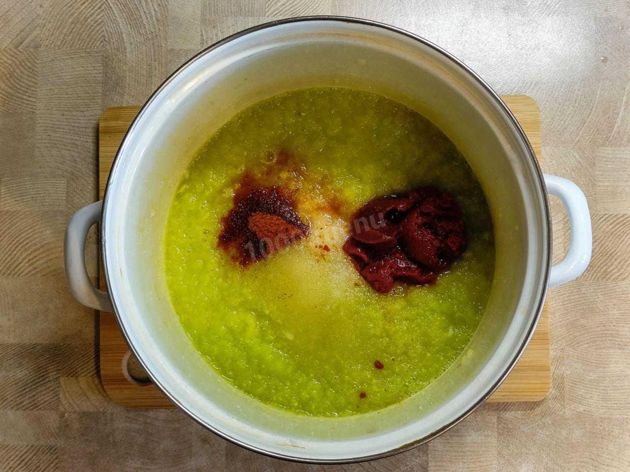 Переложите массу в кастрюлю с толстым дном. Всё о выборе кастрюли читайте в материале по ссылке под шагами. Добавьте томатную пасту, паприку, соль и сахар по вкусу. Вместо томатной пасты можете использовать нарезанные свежие томаты. На среднем огне доведите массу до кипения, затем варите соус около 30 минут на минимальном огне. Время будет зависеть от особенностей вашей плиты и желаемой густоты соуса.