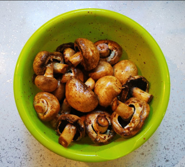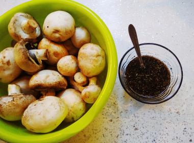 Полейте полученным маринадом грибы и хорошо перемешайте, чтобы шампиньоны со всех сторон были им покрыты. Оставьте их мариноваться минимум минут на 15, максимум на 2-3 часа. После такого маринования шампиньоны, в принципе, можно есть и сырыми, но мы сегодня готовим на гриле.