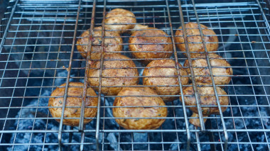 В отдельной миске сделала маринад из соевого соуса, лимонного сока, растительного масла, черного молотого перца, розмарина и чеснока. Соус влила в пакет с шампиньонами, крепко завяла его и перемешала грибы в пакете. Как мне кажется, в пакете грибы обильно смазываются соусом и лучше промариновываются. Оставила грибы на 20 минут мариноваться. Когда мангал готов, грибы выкладываю на решетку и готовлю грибы до золотистости, попеременно переворачивая решетку.