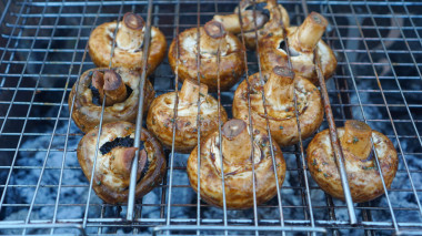 Положите решетку гриль, а на нее выложите шампиньоны. Жарьте 3-5 минут с одной стороны, затем переверните. Повторите эту процедуру 2-3 раза. Следите, чтобы грибы не сгорели.