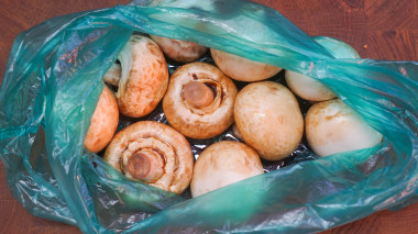 Покупайте свежие шампиньоны среднего размера, снежно-белого цвета без пятен, повреждений, запаха гнили. На ощупь они не должны быть скользкими. Тщательно промойте грибы от грунта под струей теплой или холодной воды. Вырежьте подпорченные места, если они есть. Миниатюрные грибочки размером до 2 см чистить совершенно не обязательно, достаточно их хорошо промыть. Более крупные шампиньоны рекомендуется чистить от пленочек.