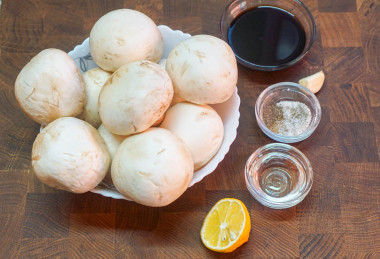 Как пожарить шампиньоны на гриле? Подготовьте все необходимые продукты. Шампиньоны берите свежие, белого цвета, хотя допускается и использование королевских шампиньонов. Вместо лимона можете взять уже готовый лимонный сок. Свежий чеснок можете заменить чесночным порошком.