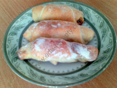Вырезаем из раскатанного теста треугольнички, небольшие, примерно 5-6 см в основании и 10 см в длину. В основание треугольника кладем немножко повидла и сворачиваем трубочкой в сторону вершины треугольника. Только не переборщите с повидлом, может подгореть.