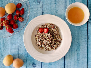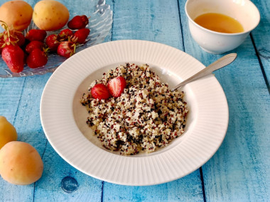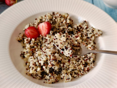 На завтрак приготовила кашу из киноа на молоке. Я использовала трехцветное киноа. И молоко у меня обезжиренное, поэтому внешне похоже на кашу на воде. Но вкус молочный присутствует) С таким молоком можно было обойтись без дополнительной воды. Варила кашу 20 минут после закипания. Потом добавила мед, накрыла крышкой на 5 минут. Оставшаяся жидкость впиталась. Орехи я не добавляла. Каша получилась рассыпчатая. Белые зерна разварились сильнее остальных, но форму свою сохранили. Мне кажется, такая молочная каша получится вкуснее и нежнее из белого киноа. Но и разноцветное получилось очень вкусно. Спасибо за рецепт!