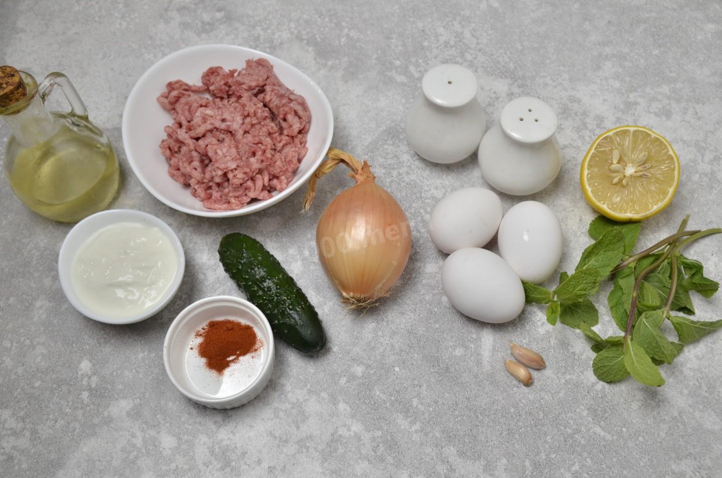 Как сделать говядину с яйцом? Подготовьте продукты. Вы можете взять кусок мяса и сделать из него фарш самостоятельно или использовать уже готовый, как у меня. Для соуса вместо йогурта подойдут также кефир или сметана. А вместо мяты (или вместе с ней) — укроп, петрушка, зеленый лук. Рецепт рассчитан на 4 порции, я готовила половину.