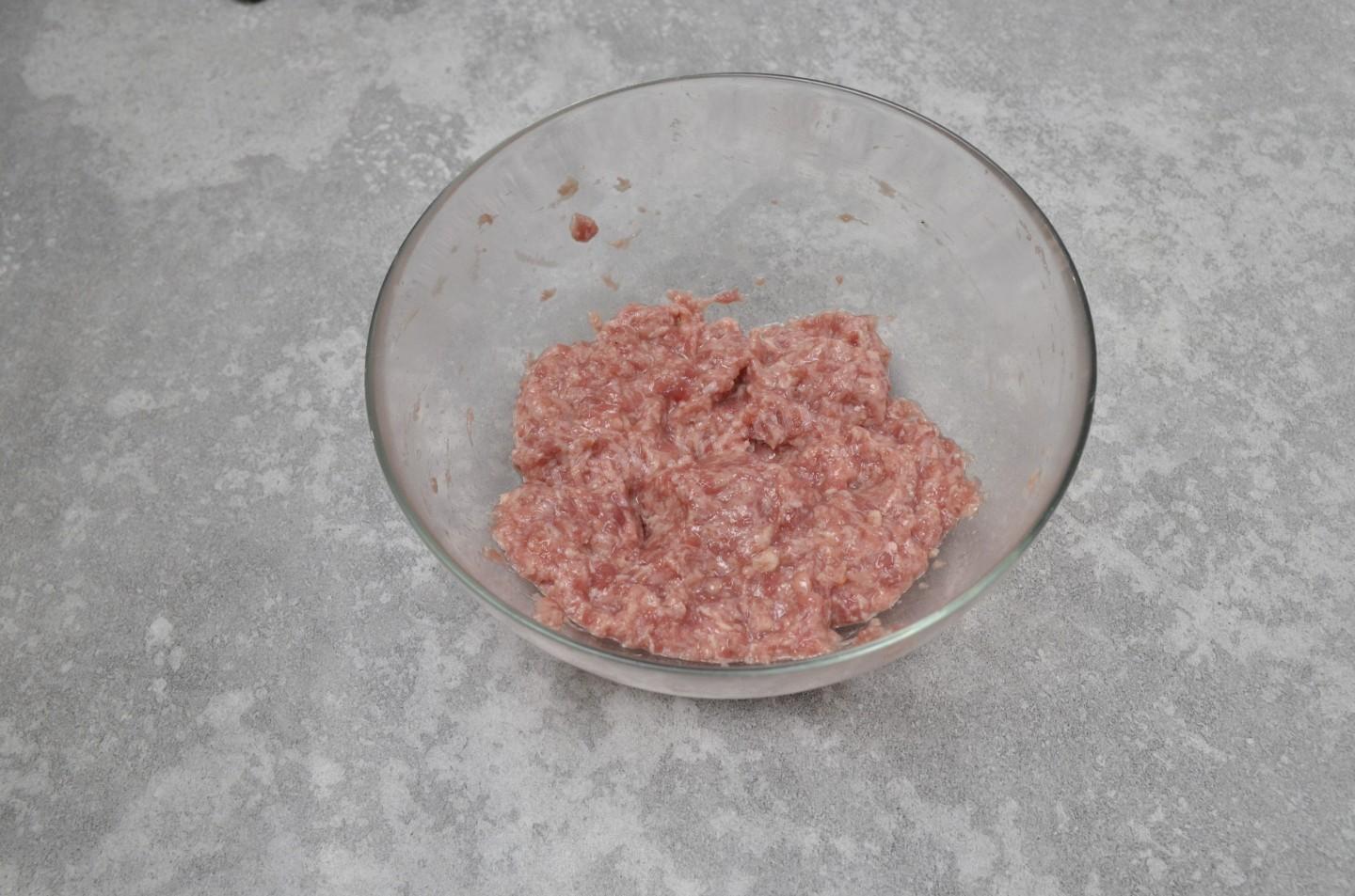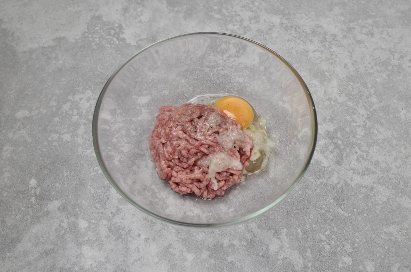 Перемешайте и немного отбейте фарш о дно миски. Уберите его на 20 минут в холодильник.