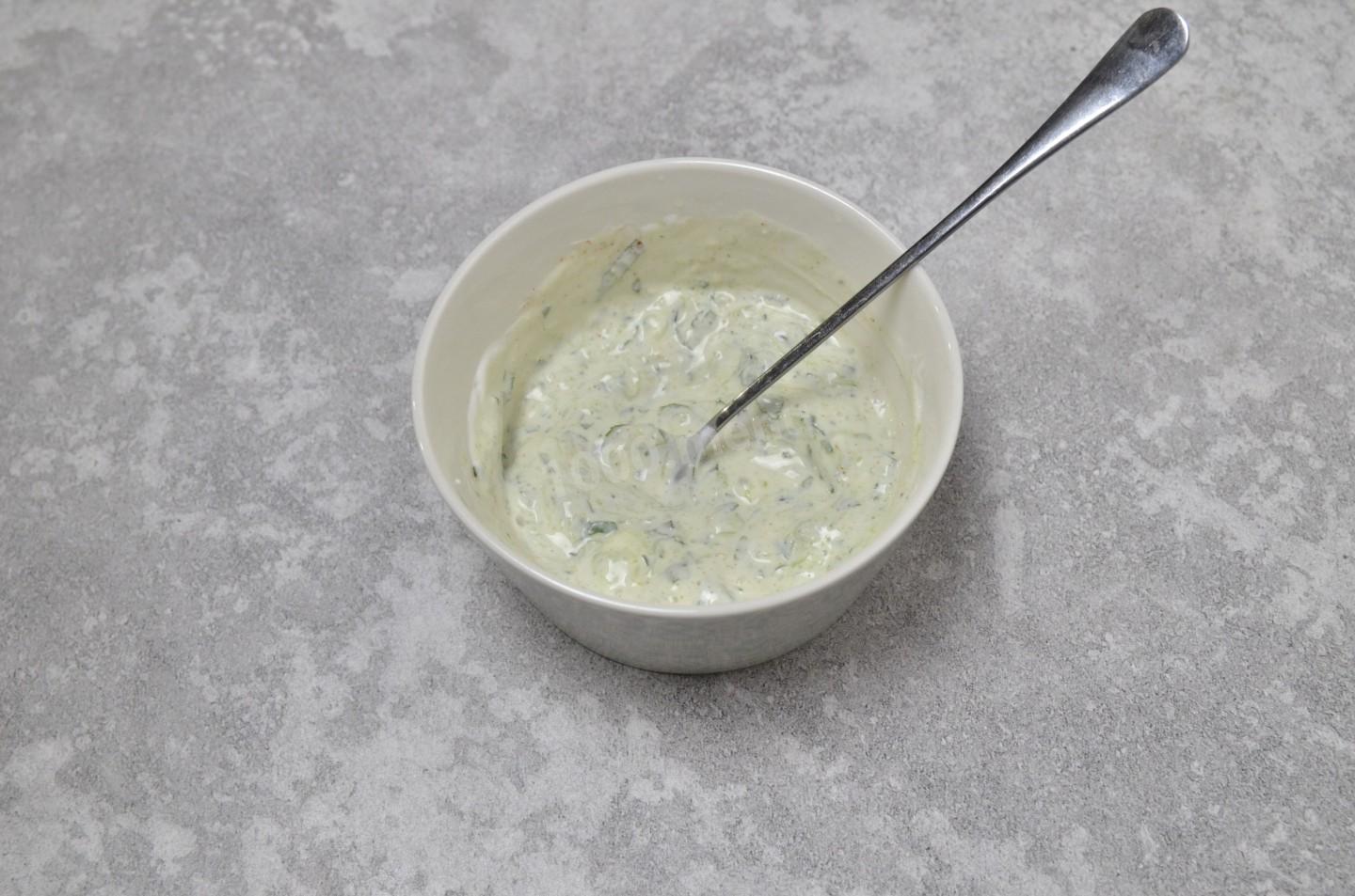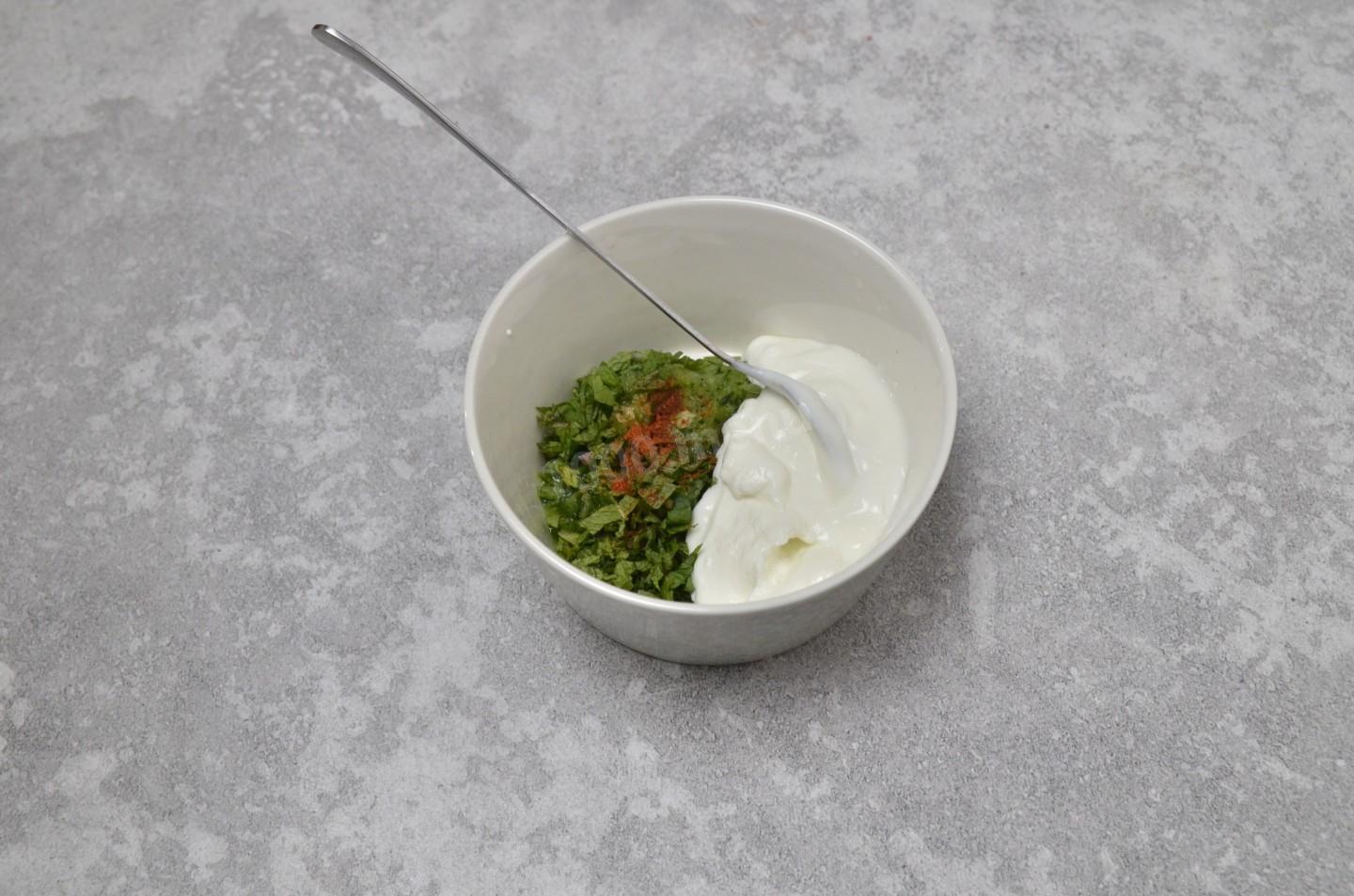 А пока приготовьте соус. Огурец натрите на мелкой терке. Чеснок выдавите через пресс к огурцу. Мяту (или другую зелень) мелко нарежьте. Добавьте ко всему этому йогурт и немного паприки.