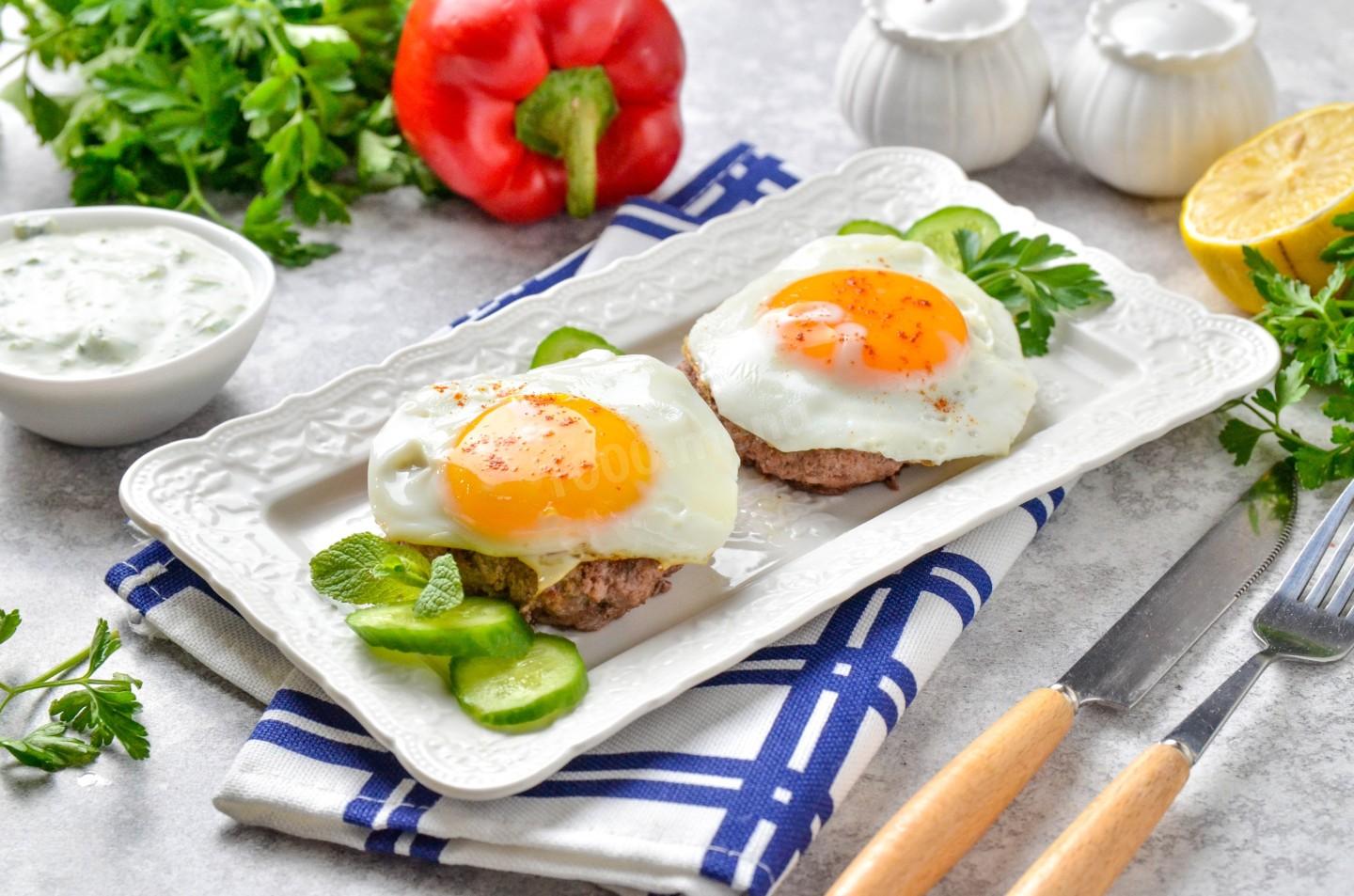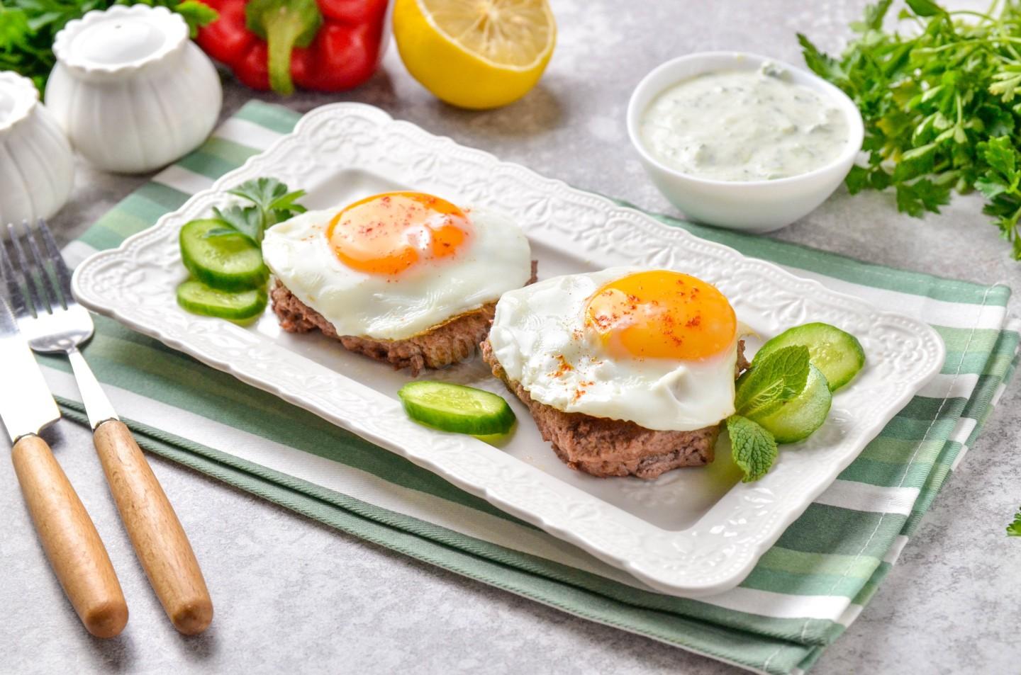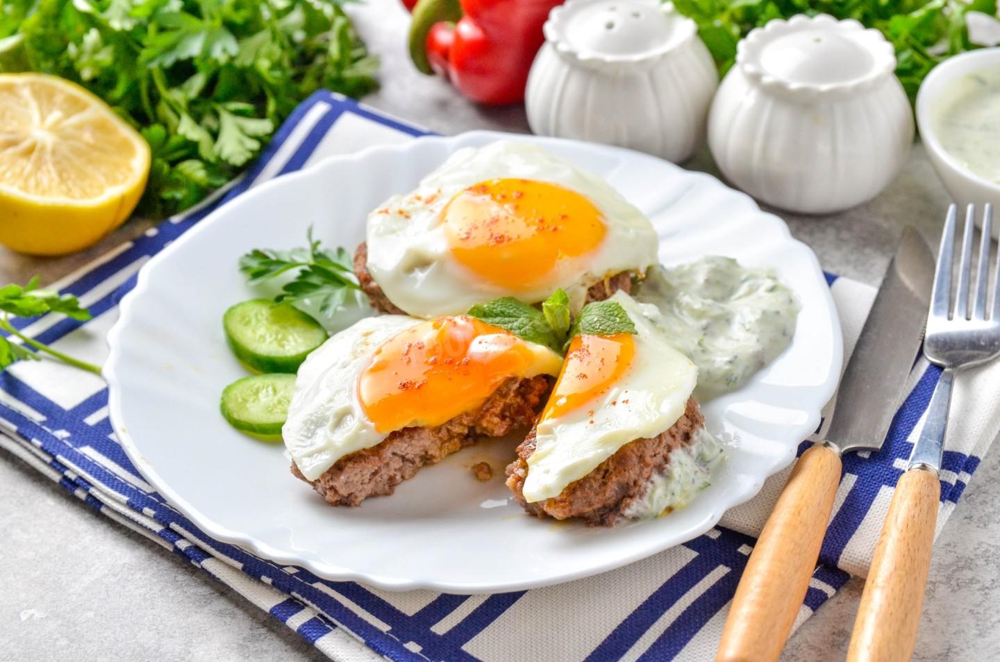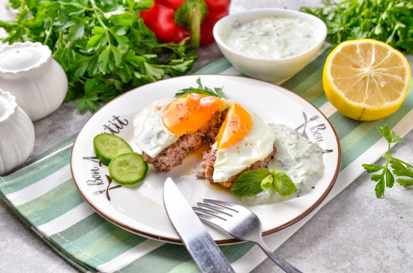 При подаче выложите на тарелку бифштекс, на него — глазунью из яйца. Посыпьте паприкой. Подайте к блюду соус из йогурта. Приятного аппетита!