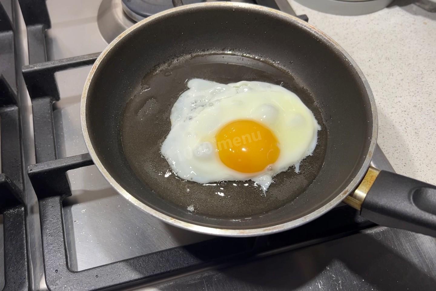 Одновременно на другой сковороде пожарьте поочередно глазунью из оставшихся яиц (у меня 2, для полной версии рецепта 4).
