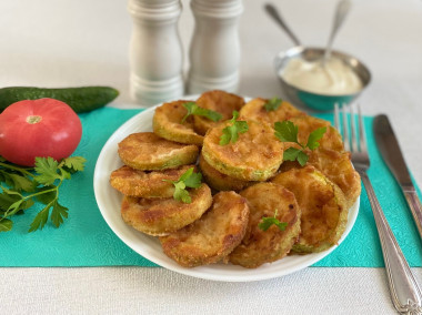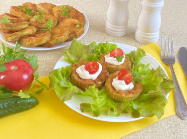 Лето, кабачки уже жарили и в муке, и оладушками, а вот кабачки кружочками в кляре в сухарях еще не пробовали, вот и решила приготовить.