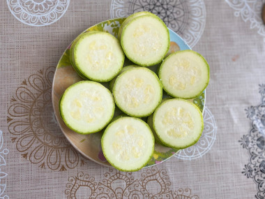 Кабачки помойте в проточной воде и обсушите, отрежьте хвостик. Если кабачки зрелые, то срежьте кожуру и вычистите семена. Нарежьте кабачки кружочками толщиной примерно 1 см. Немного посолите и подождите минут 10. Кабачки выпустят лишнюю влагу. Промакните их бумажным полотенцем.