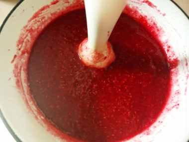 Затем измельчите все блендером до однородного состояния. Половину перетертой малины с сахаром можно, как я, заморозить, остальное - закрыть в банке.
