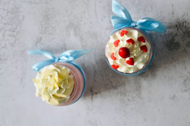 Украсила творожным кремом, завязала бантики. Одну баночку сделала с ягодой и посыпкой сердце... другую баночку украсила миндальными лепестками.