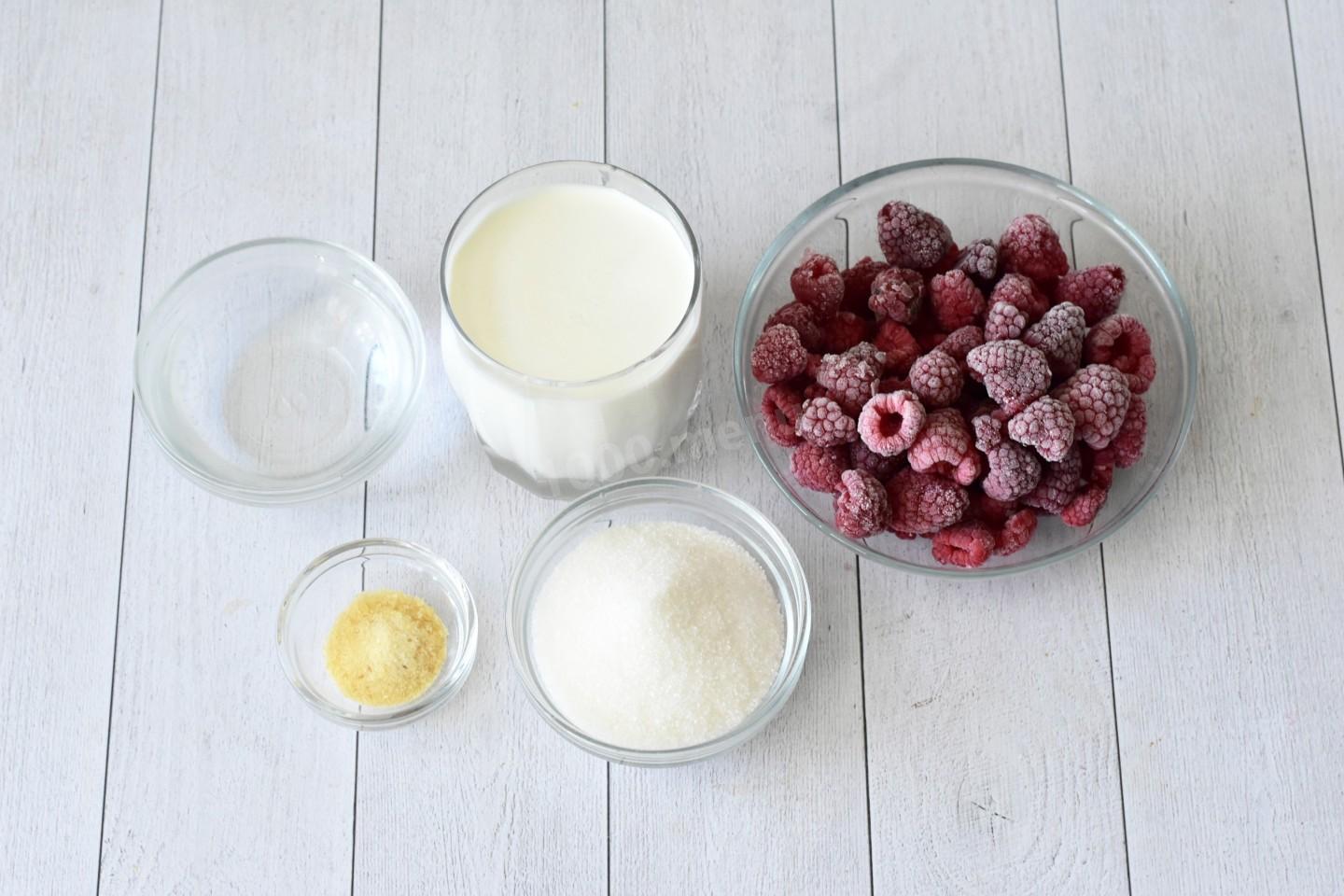 Подготовьте необходимые ингредиенты по списку. Сливки нужны жирностью 33-35%, подходящие для взбивания. Ягоды можете использовать любые, свежие или замороженные. У меня замороженная малина. Заранее ее разморозьте, сохранив сок.