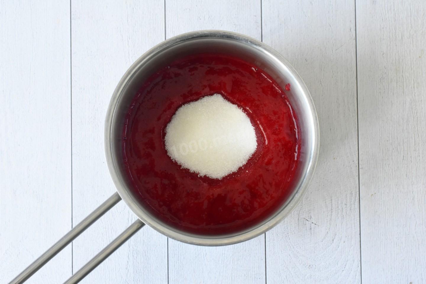 Малиновое пюре вылейте в сотейник или в кастрюлю. Добавьте сахар и перемешайте. Поставьте сотейник на медленный огонь и, помешивая, доведите до кипения.