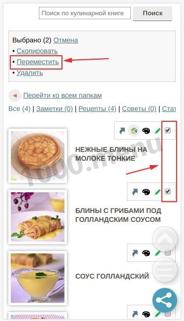 Здравствуйте! Подскажите, пожалуйста, как можно в телефоне в кулинарной книге переместить рецепт из одной папки в другую?