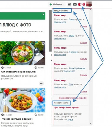 - рядом висит колокольчик - он тоже красный - когда уведомлений в нем много, все они сливаются друг с другом; блоки никак не отделены - Уведомления и Новости сайта стоят друг за другом на одинаковом белом фоне. Визуально это выглядит не очень удобно.
