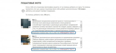Красный текст лучше было бы выделить жирным, чтобы легче в глаза бросалось. Когда шагов на странице много, очень легко пропустить один-два, где текста больше, чем нужно. Публиковать рецепт все равно разрешается, текст автоматом обрезается - и так его можно потерять.