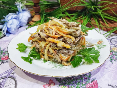 Салат с печенью солеными огурцами и морковью действительно, очень вкусный, его можно приготовить и на праздничный стол, и на обычный обед или ужин. Еще один вариант блюда с печенью разнообразил наше меню, а то паштеты и жареная печенка уже приелись. Я поэкспериментировала и ещё фасоли добавила. Спасибо преспасибо!