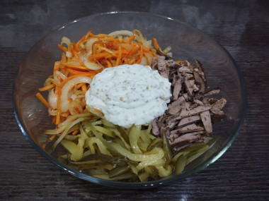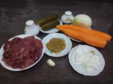 Как сделать салат с печенью и огурцами? Подготовьте все необходимые продукты для салата. Печень подойдет любая как говяжья, так и свиная, куриная. У меня была свиная печень. Так же нам понадобятся три небольшие моркови, две луковицы, два крупных маринованных огурца, майонез, сметана, французская горчица, чеснок, соль и перец.