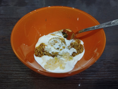 Приготовьте пикантную заправку для салата. Для соуса-заправки возьмите майонез и сметану в равных пропорциях, горчицу зернистую, выдавите зубчик чеснока, немного поперчите.