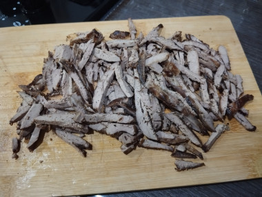 Можно разложить готовую печень на бумажную салфетку, чтобы удалить излишки масла. Когда печень остынет, нарежьте ее тонкой соломкой.