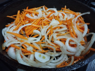 Обжарьте лук и морковь на подсолнечном масле на медленном огне до готовности и дайте остыть.