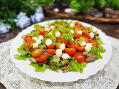 Этот салат с грибами, помидорами и сыром — кладезь полезных элементов. Шампиньоны содержат белок и витамины группы B, помидоры черри богаты антиоксидантом ликопином, а свежие салатные листья и легкая заправка на оливковом масле с лимонным соком обеспечивают организм витаминами и полезными жирами без лишних калорий. Идеально для полезного перекуса или легкого ужина.