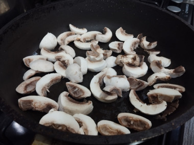 Обжарьте нарезанные шампиньоны на сковороде, слегка смазанной растительным маслом для жарки. Небольшого количества масла будет достаточно, чтобы пластинки слегка зазолотились. Шампиньоны вообще можно употреблять сырыми, поэтому время обжарки совсем небольшое — пара минут с каждой стороны.