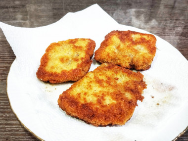 В сковороде на среднем огне разогрейте часть растительного масла и обжарьте на нем шницели примерно по 3-5 минут с каждой стороны до образования румяной корочки. Готовые шницели переложите на тарелку. На сковороде можете разогреть еще немного масла и обжарьте следующую партию шницелей.