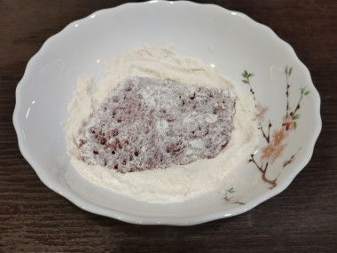 Муку для панировки высыпьте в миску. В муку также можете добавить немного соли по желанию. Говяжьи ломтики слегка обваляйте в муке, так кляр будет лучше обволакивать мясо.