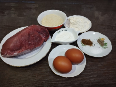 Льезон сделала из столовой ложки сметаны и двух маленьких яиц. Добавила в него щепотку соли. Немного соли бросила и в муку для панировки мяса. Из специй взяла готовую приправу для мяса. В остальном следовала рецепту шницель из говядины на сковороде.