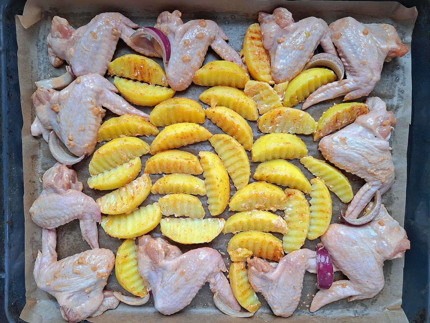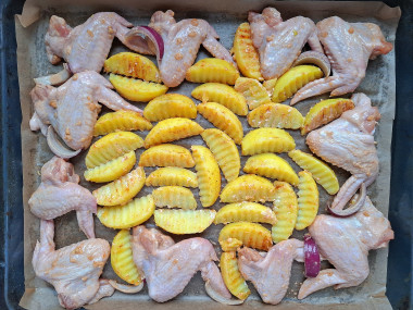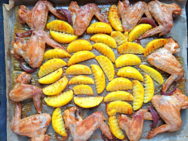 Крылышки на противне в духовке с картошкой - это простое, но вкусное и сытное блюдо. Я приготовила к семейному ужину, но его вполне можно подать на праздничный стол.